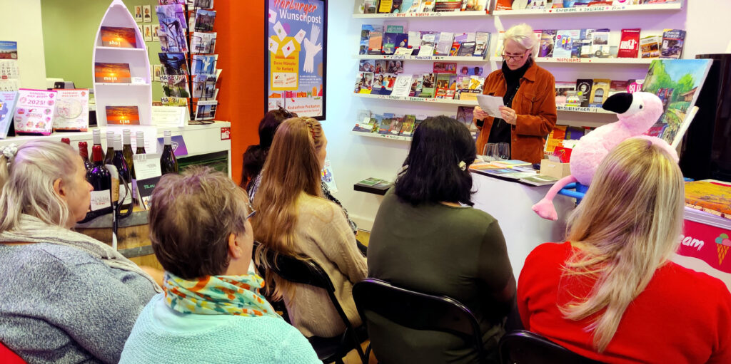 Am 2. November war es so weit. Der Harburg Info Shop öffnete im Rahmen des Harburger Kulturtags seine Räume zum ersten Mal für Lesungen lokaler Autor:innen. Vor einem interessierten Publikum lasen Ulrike Burbach aus Neugraben sowie Gisela Baudy und Christian Baudy aus Harburg aus ihren “Coloured Stories” zum Thema Umwelt und Stadtentwicklung. Dabei präsentierte Christian Baudy seine Übersetzung von Gisela Baudys Geschichte “Der rote Papagei”.